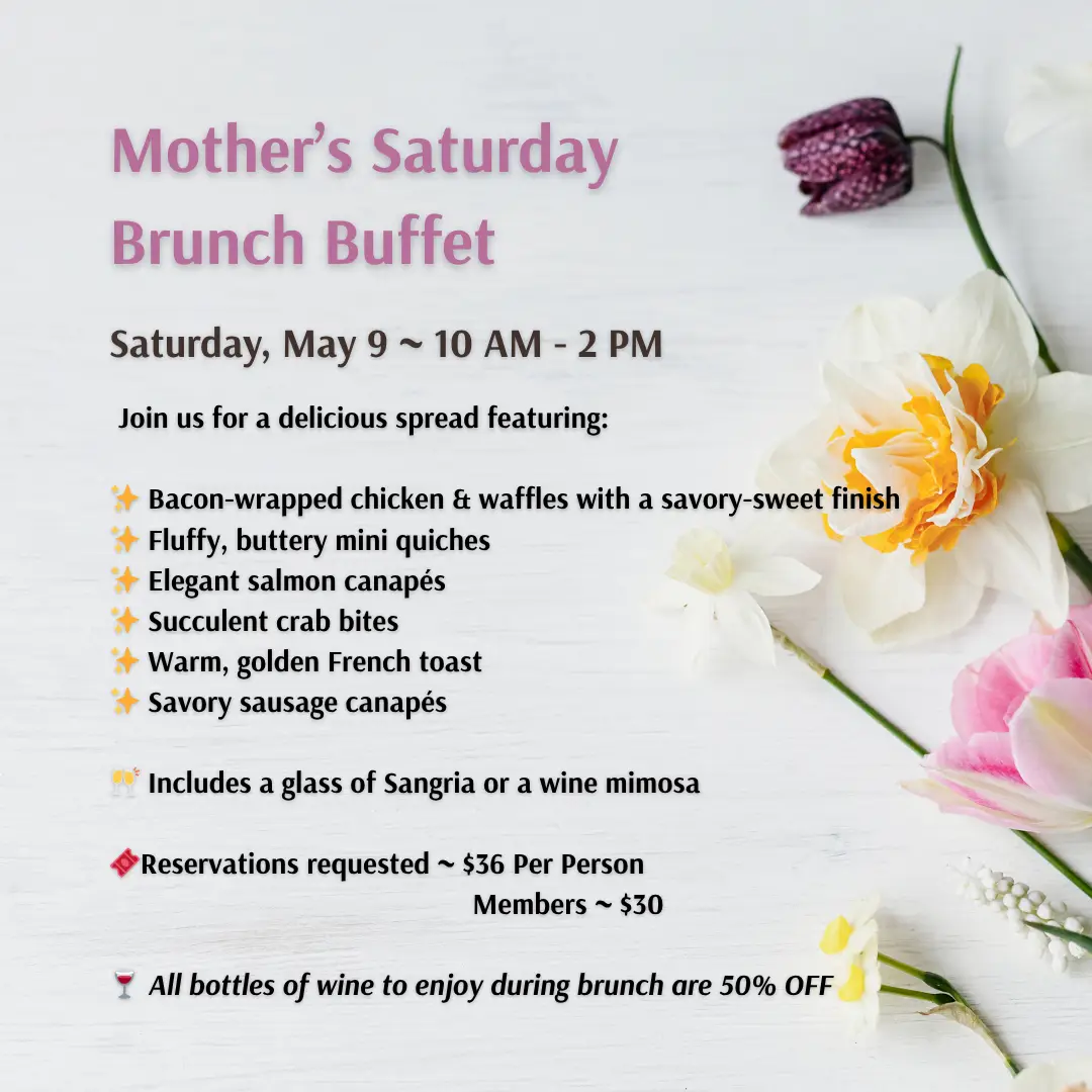 Join us for a relaxed, delicious Mother’s Saturday Brunch Buffet filled with sweet and savory favorites—plus a complimentary sangria or wine mimosa.